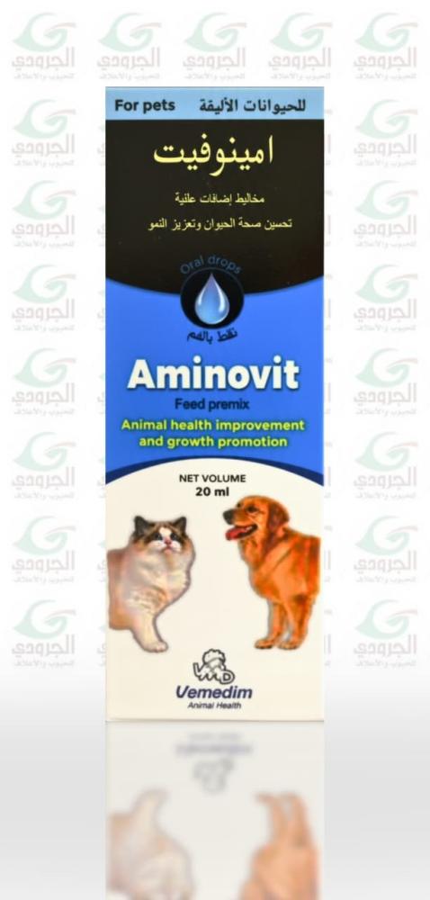 امنح حيوانك الأليف جرعة من القوة والحيوية مع Aminovet أمينوفيت، الفيتامين المتكامل المصمم لدعم الصحة العامة والطاقة والمناعة بتركيبة متطورة من الأحماض الأمينية والفيتامينات الضرورية لتغذية الجسم من الداخل وتحسين الأداء اليومي لحيواناتك الأليفة.